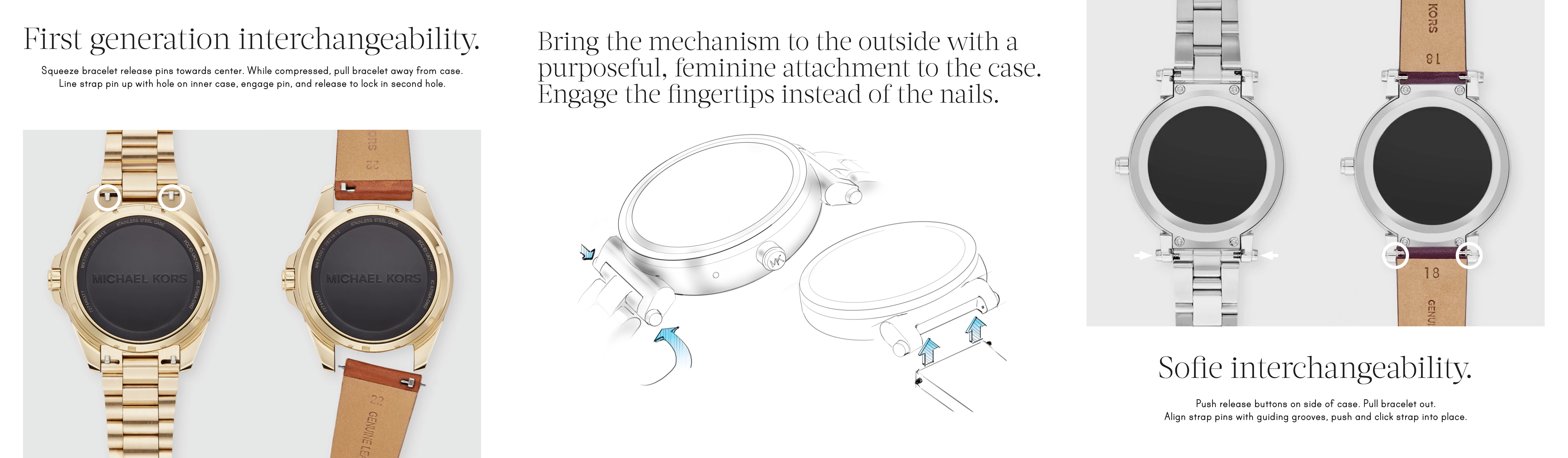 Previous to this case, crystals on the bezel were not possible—as the most iconic element of Michael Kors watches—I worked closely with the engineering team to execute a case design both appropriate for the brand but one that would also not interrupt the functionality of the smart features or the production lines. This was crucial to the success of Michael Kors Access.